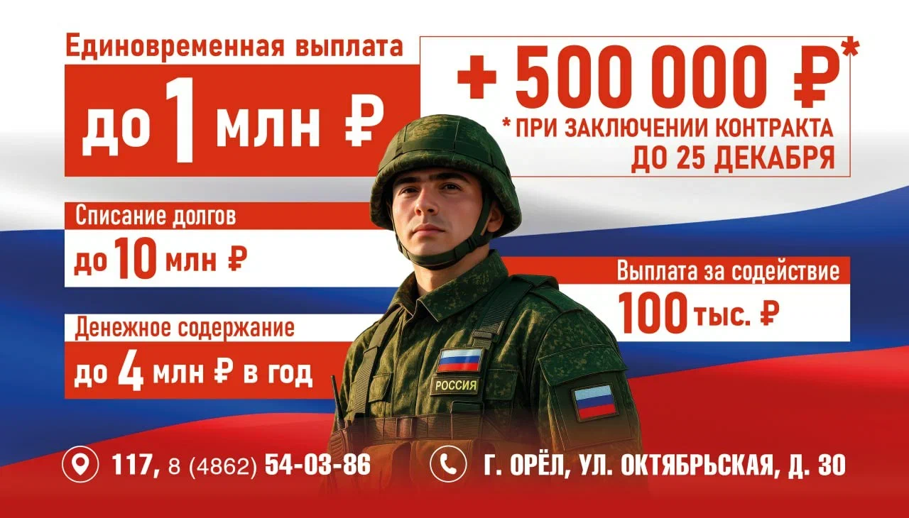 * добровольцы, которые подпишут контракт с ВС РФ до 25 декабря 2025 года, получат дополнительную выплату в 500 тысяч рублей.